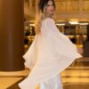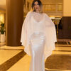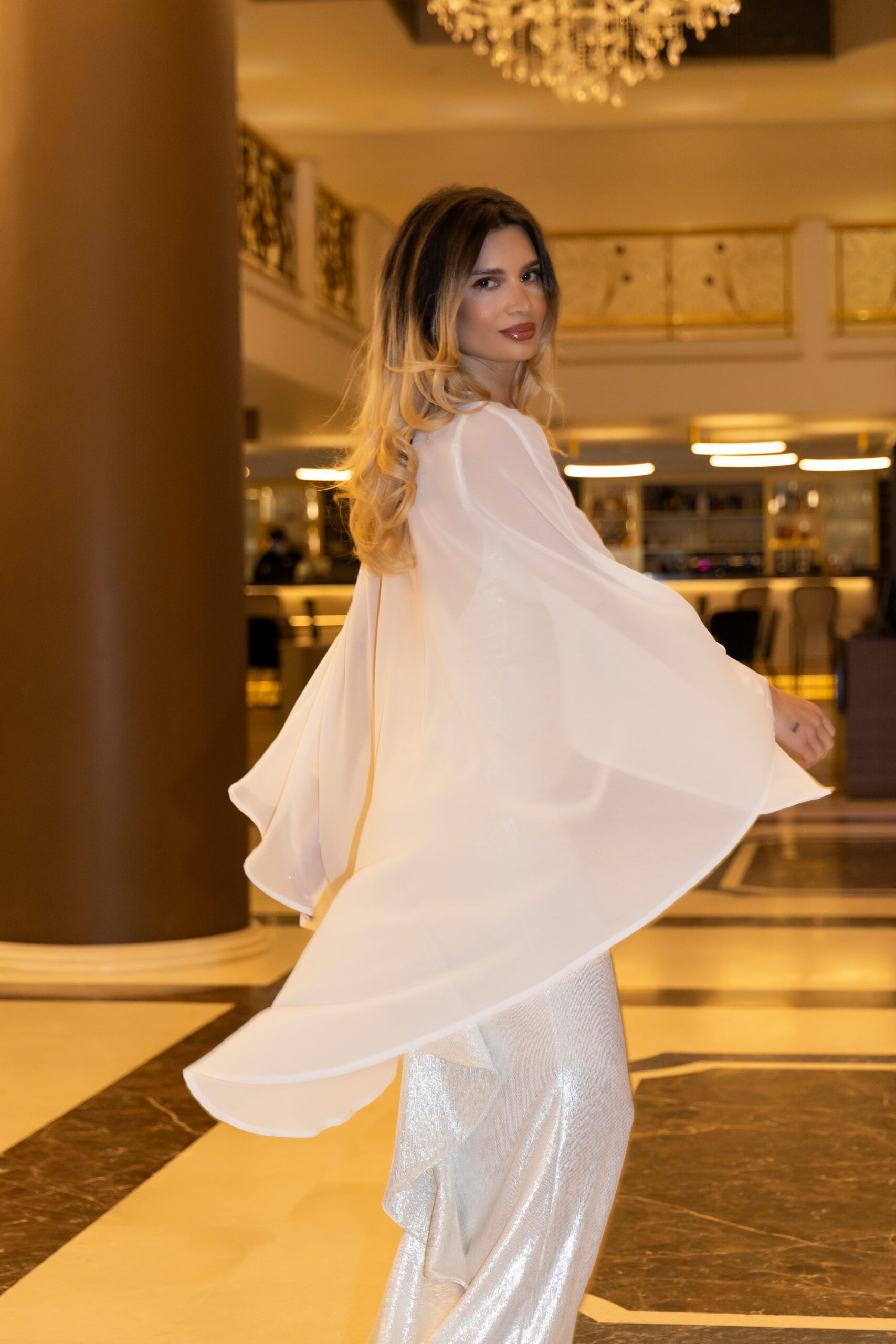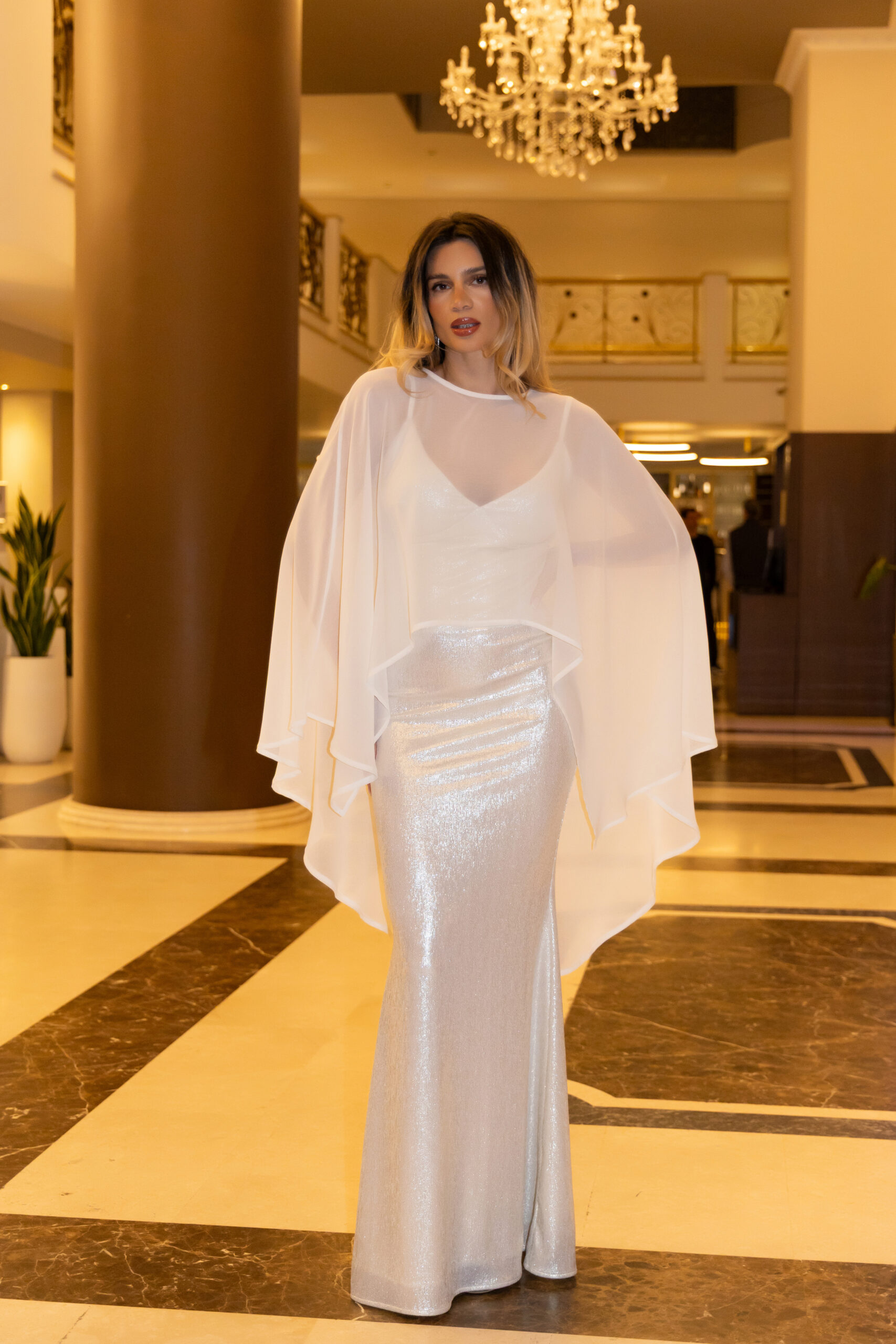 Στις φωτογραφίες το φόρεμα συνδυάζεται με αέρινη chiffon κάπα και εσάρπα σε μορφή φουλαριού, τα οποία διατίθενται ξεχωριστά.