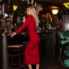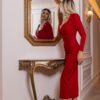 Κομψό midi φόρεμα για καλεσμένη σε γάμο και εκδήλωση, με σούρες που κολακεύουν τη σιλουέτα και λαιμόκοψη σε σχήμα καρδιάς για θηλυκή αλλά διακριτική εμφάνιση.