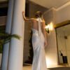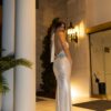 Η εφαρμοστή γραμμή αγκαλιάζει το σώμα, ενώ η ανοιχτή πλάτη δημιουργεί μια κομψή και θηλυκή σιλουέτα. Ένα φόρεμα που μπορεί να φορεθεί σε γάμο, βάπτιση, pre-wedding εκδήλωση ή bachelorette.